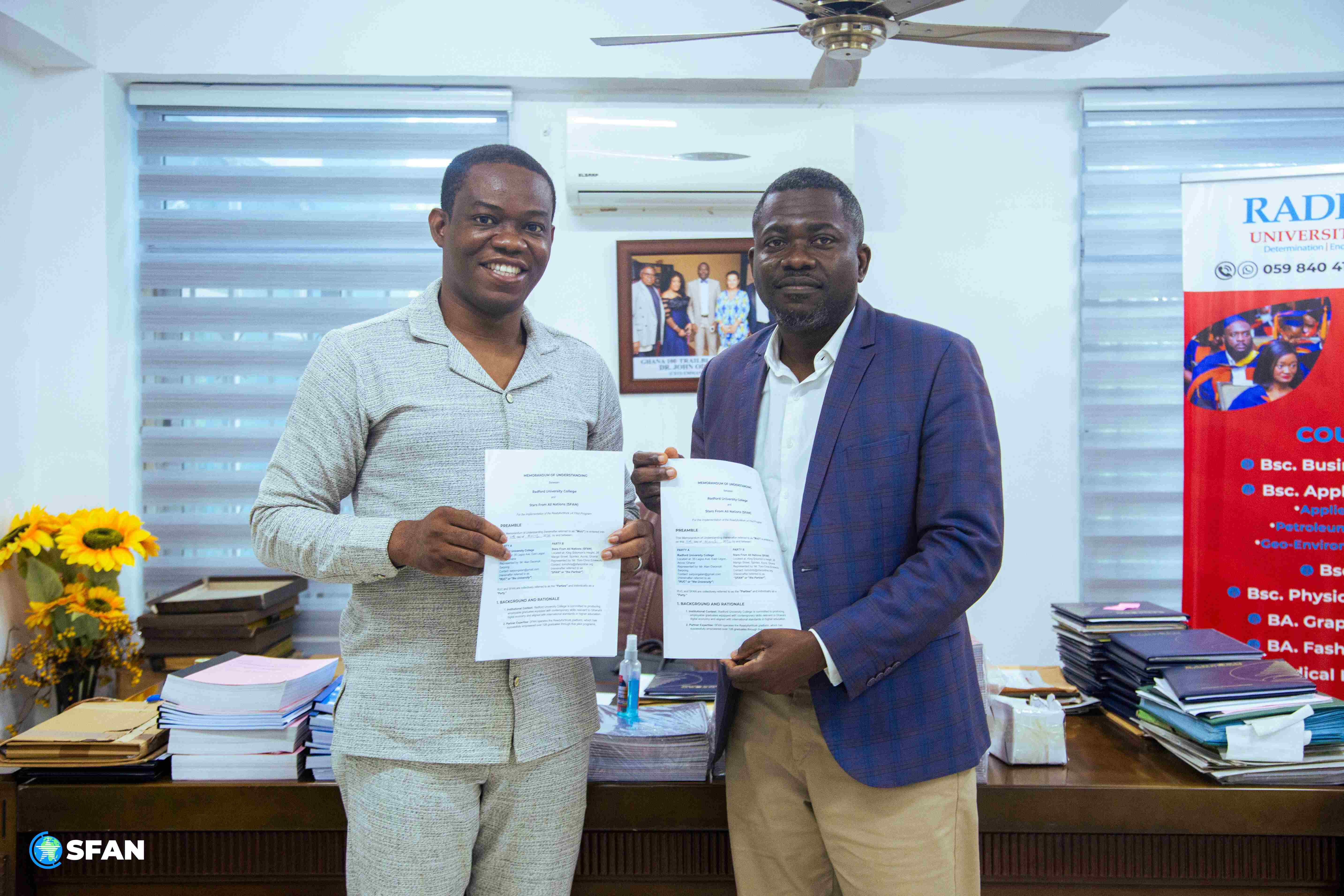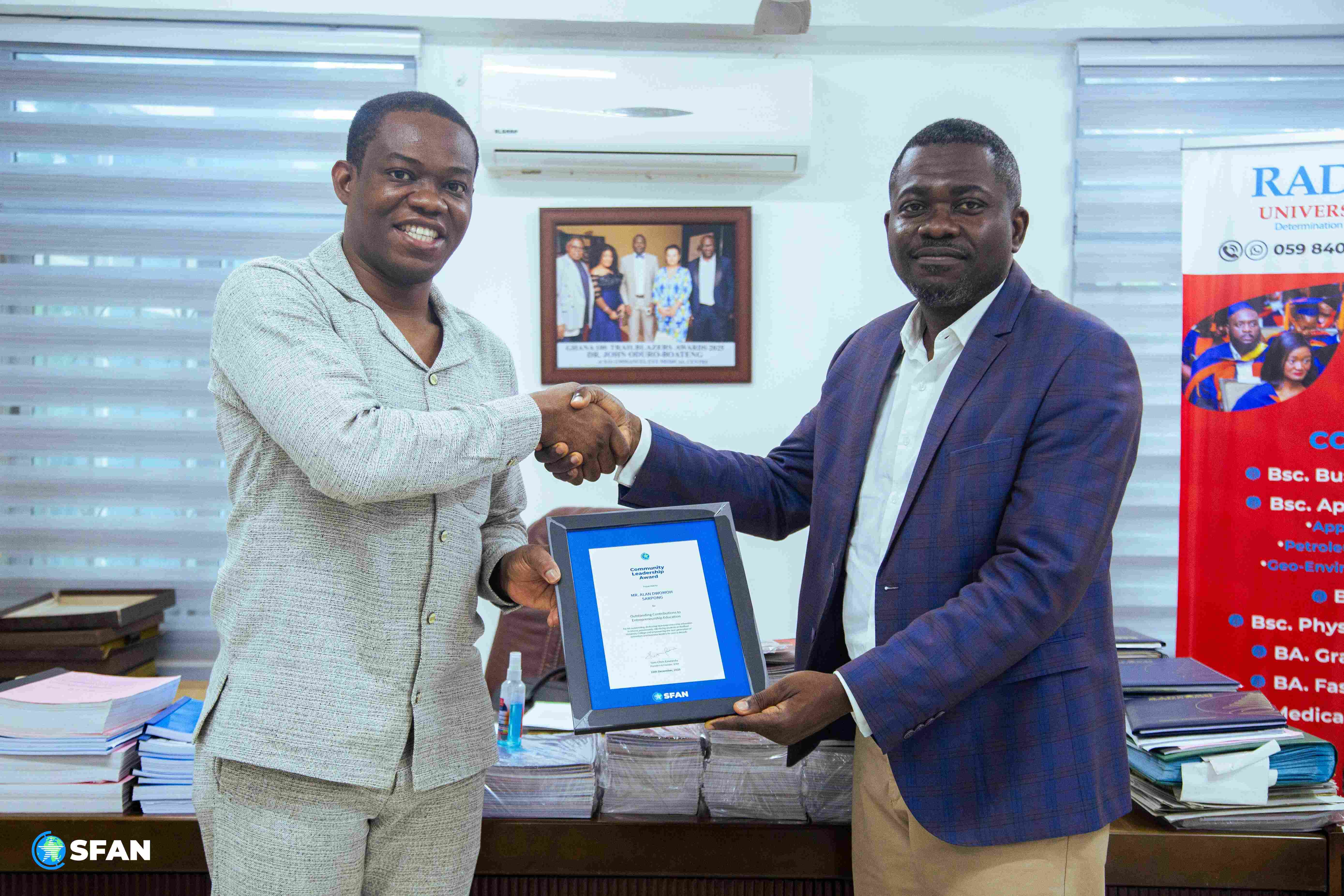 Accra, Ghana (March 11, 2026) – Stars From All Nations (SFAN) celebrated a momentous occasion today, presenting the prestigious Community Leadership Award to Mr. Alan Dwomoh Sarpong, Director and Entrepreneurship Lecturer at Radford University College, in recognition of his outstanding contributions to community development and youth empowerment. The event culminated in the signing of a strategic partnership between SFAN and Radford, aimed at equipping students with cutting-edge artificial intelligence skills and facilitating their entry into the modern workforce.